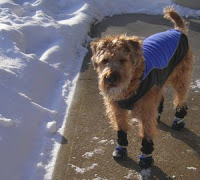 Rourke in his new gearAnyway, Rourke was concentrating on the sights and smells and how good he looked. I was concentrating on what havoc my latest antagonist was going to mete on my hero and heroine. I think it was just about the time when I thought, he's going to kill now with the gun in... when I heard the crunch of a heavy foot on hard-packed snow, swung around and was faced with a man directly behind me. Where had he come from? I must have had fear on my face for he was immediately apologizing. Just a jogger, who I normally would have heard a block away. And in my defense - Rourke jumped too.What a pair we make. I sure hope the jogger wasn't a blogger or Rourke and I might be featured as the scaredy-cat duo. Seriously, I don't dream all the time but when I'm cooking up a novel the tracts between reality and fiction can get mighty thin.