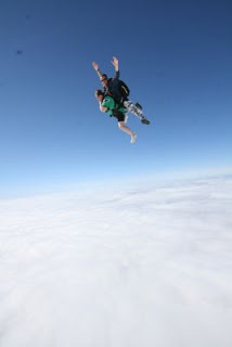 Farmer is standing outside the plane on a ledge waiting for Wyatt and me, so he can get the pictures of me exiting the plane. I duck, walk to the door with Wyatt attached to my back and look down at nothing but clouds and the next thing I know I am falling. 14,000 feet and 120 miles per hour. My heart is in my shoes. The wind is screaming by me. The thoughts going through my head are "what the hell were you thinking?" Wyatt taps me on the shoulder and tells me to spread my arms.