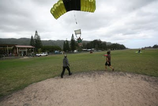 Soon we hit the clouds and let me tell you they hurt. The temperature drops and we begin to be pelted by ice pellets. All around is whiteness. Once we break the clouds the Noth Shore comes into view, the mountains, the ocean with whitecaps and the airfield where we will be landing. Farmer waves goodbye as Wyatt opens our parachute and up we go. Another change, this time to peace and calm. I look straight down my body at the ground below. It is like standing on a piece of glass and looking at the land far below your feet, that is when I realized that the only thing holding me in place is the harness I am wearing and being strapped to Wyatt.