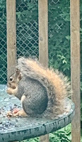 That's what comes to check out my handful of treats each morning - squirrels and one widow crow - He may or may not be a widow but he always comes in alone for one of the peanuts I lay out every morning. The squirrels? - they're all carrying on like nothing has changed in their word. And social distancing, they've always done that. It's called: "Take one step closer to that peanut and we'll see how fast you can run!" Yes, when it comes to food, the squirrels aren't too social. And this morning, after yet another rain, they were looking a little damp as they came in to see what I may have left for them.