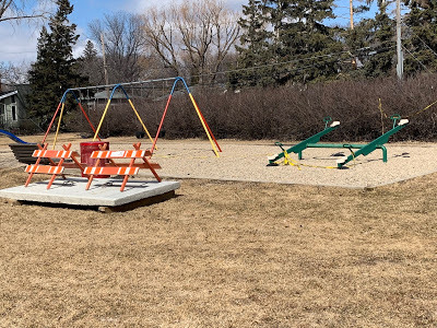The path I'm walking now winds for miles along the outskirts of the city. It's become a favourite means of meditation and exercise these last weeks. So far, there's no social distancing required - it's empty, of people that is. Today, I did see a trio of robins and a squirrel. I also had two kindly dogs bark at me. I gave them a quick hi as they remained safely distanced behind their fences and I continued on my way.The playground equipment in an empty park caught my eye. The swings and teeter totter had caution tape across them and a barricade was placed in front of all of it. That just made me feel uneasy. I left the park and headed toward the street and the easement beyond. Before I got there I saw one woman jogging, we did a polite across the street dodge and went on our way. Me turning to walk down the empty easement. It's rather eerie. Yesterday at least when I reached the end of one block, there had been the family walking down the street. I'd waited until they were on the intersecting street before heading down the next easement. I even waited longer than necessary but mostly because of a small boy dressed as a - I'm not sure, but I'm guessing, gopher. It was a full furry body suit, brown and covered everything including his head - I'm assuming that it didn't cover his face but I didn't get that close. I wanted to ask in the worst way, what he was pretending to be. But - the social distancing thing. Thus, I can't tell you for sure what animal he was pretending to be but I'm betting he was at least warm.