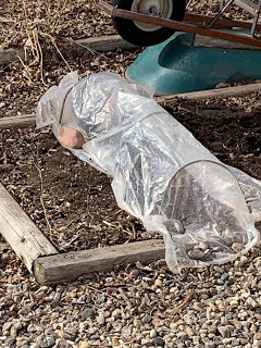 4) The Spanish Onion is sprouting and too big for any of my containers. I'm taking a risk here but my mini greenhouse - sheets of plastic with hoops - allows me to go direct to garden. One onion, one experiment. Fingers crossed it survives the weather which can still dip to below zero. If it survives that, I'm pretty sure the squirrels will leave it alone.