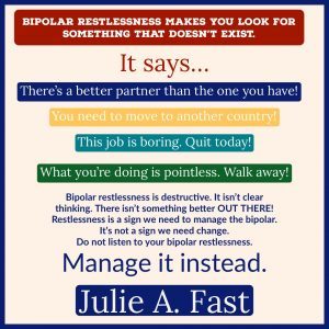 I still have bipolar restlessness, but I sit with it and work through it. Before I was diagnosed, I averaged three to four jobs a YEAR.