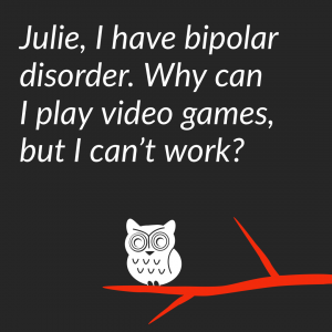 JulieMy Facebook groups: If you’re a partner, please join me on The Stable Bed. If you’re a parent of a child with bipolar disorder, please join me on The Stable Table. If you have bipolar and want to learn more about how to help those around you understand what YOU need, join me on my Julie A. Fast Facebook page. I teach bipolar basics on my Instagram. If you want more information on The Bipolar Conversation, this article on the Bp Magazine Website gives more details.