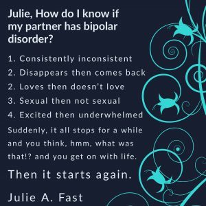 I will be on my JulieFastInstagram page to answer questions from partners of people with bipolar disorder. I hope you will join me.