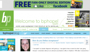 BP Magazine asked all of the bloggers to write about accepting the bipolar disorder diagnosis. This was actually a hard topic to write about. There are a few different kinds of acceptance when it comes to bipolar disorder- I wrote about what it means to me and then had a revelation. Here is the first paragraph of the post and then a link to the magazine blog. (If you don't have a subscription to the awesome magazine- I highly suggest trying it out. I learn so much- it's good for family, partners and health care professionals too!)