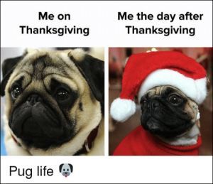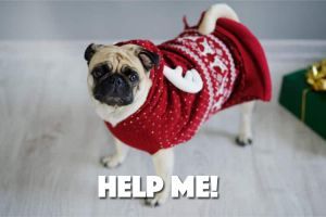 “Excuse me,” I said to the lady with a unhappy looking pug wearing a Christmas romper with writing on it. “What does it say on your dog’s sweater?”