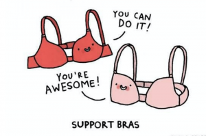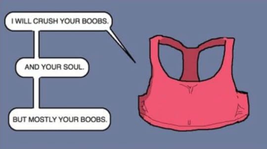 Instead of my tried and true bras, they now had these lacy padded things which anyone with large ladies know will make you look like you have four sets of cleavage. Then she showed me another style that smushed everything together to create the dreaded uniboob. Finally, she introduced me to a third style with some improved technology that supposedly gave you support without an underwire, but in reality had your boobs resting on your knees.