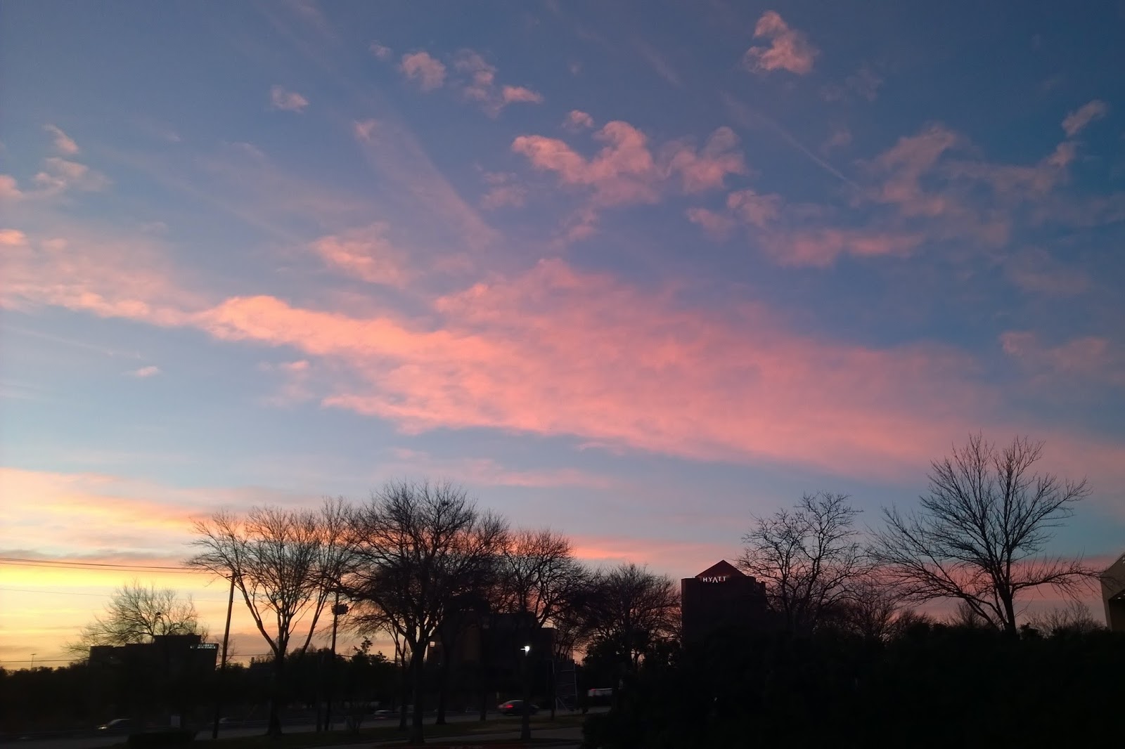 फिर कमरे की खिड़की से पर्दा हटा के झांके तो देखते है कि भगवान् ने पूरा पूरा पेंट का डिब्बा ही उलट दिया है आसमान पर. बाहर मौसम में ठंढक होगी लेकिन हम दीवानों की तरह बाहर भागे. मोबाइल फोन और कमरे की चाभी के साथ. उफ़. क्या ही सुबह ही. गहरे गुलाबी और फिरोजी रंग की. ठंढ थोड़ी से ज्यादा. मैं बाँहें फैलाए नाच रही थी गोल गोल गोल. कितना सुन्दर...ओह कितना सुन्दर...पूरा पूरा आसमान... ठंढी हवा अच्छी लग रही थी. ताजगी भरी. ओसभीगी. साढ़े छः बजे नाश्ता और पानी दोनों मिला. खाने का असल स्वाद भूख से आता है. थोड़े से फल. पैनकेक. एक स्लाइस ब्रेड और दो कप अच्छी कॉफ़ी. बगल वाली टेबल पर हिन्दुस्तानी लड़के हिंदी में बतिया रहे थे. 'गर्म कपड़े पहन लेना आज, मेरी कल लंका लग गयी थी'. मैं बैंगलोर में हिंदी के लिए तरसती रहती हूँ और हिंदी मुझे मिलती है यहाँ डैलस में आ के. मन किया उनसे बात करने का. मगर फिर लगा पता नहीं क्या सोचेंगे. तो रहने दिया.