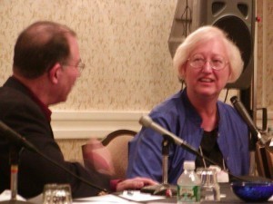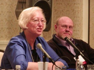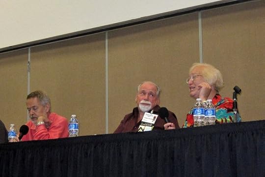 Connie with Gary K. Wolfe (left) and Robert Silverberg (center) on the Charles Brown memorial panel.
