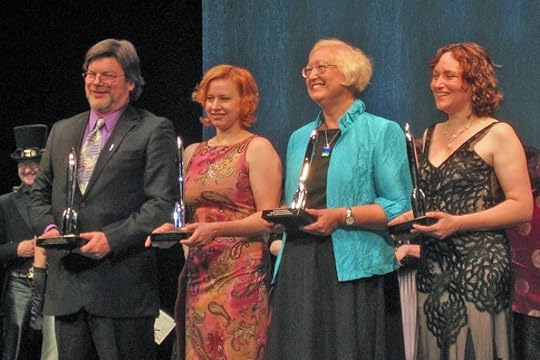 Hugo Fiction Winners Allen M. Steele, Ted Chiang's acceptor, Connie Willis, Mary Robinette Kowal (left to right)