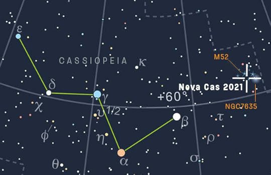 Nakamura spotted it through a telescope. It’s not visible to the naked eye yet, but it will be in a month or so as it grows brighter and brighter. Right now you can see it with binoculars. It’s been officially named Vi405 Cas.