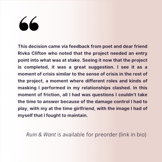 First and foremost, I am proud to have my lyric memoir, Ruin & Want (Sundress Publications), out in the world! Thank you to everyone who has gotten a copy and spent time with it. I appreciate all the kind words folks have shared.