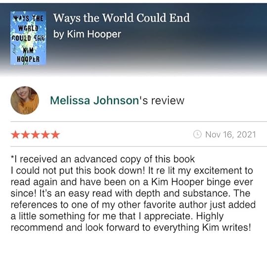 “In Ways the World Could End, Kim Hooper has given us a father grieving for his wife, a daughter grieving for her mother, and in the absence of the woman they both loved and relied on to make sense of the world, a seemingly unbridgeable gap between the two of them. With tenderness, humor, candor, and insight, Kim Hooper brings her characters from darkness to light in a story that’s ultimately about the power of love.”