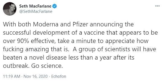 Not much, honestly. I’ve been purposefully avoiding the news for the sake of my mental health. The COVID crisis is overwhelming. I’m so happy (and relieved) that vaccines are here and that healthcare workers are starting to get protection so they can keep doing their amazing jobs.