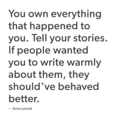 “Toni Morrison said, ‘The function of freedom is to free someone else,’ and if you are no longer wracked or in bondage to a person or a way of life, tell your story. Risk freeing someone else. Not everyone will be glad that you did. Members of your family and other critics may wish you had kept your secrets. Oh well, what are you going to do? Get it all down. Let it pour out of you onto the page.”