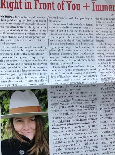 The solution is finding ways to connect fiction with the more casual readers who want books they’ll like served up to them. The key words there: THEY’LL LIKE. Nothing is more frustrating than starting a book and realizing it’s not your cup of tea. It feels like a waste of time, effort, energy, and MONEY. My daydream: a matchmaker book app, something where authentic recommendation-giving can happen. I’ve learned not to trust the “if you liked X, you’ll love Y” advertising I see on Amazon and the like. Often, those mentions are paid-for.