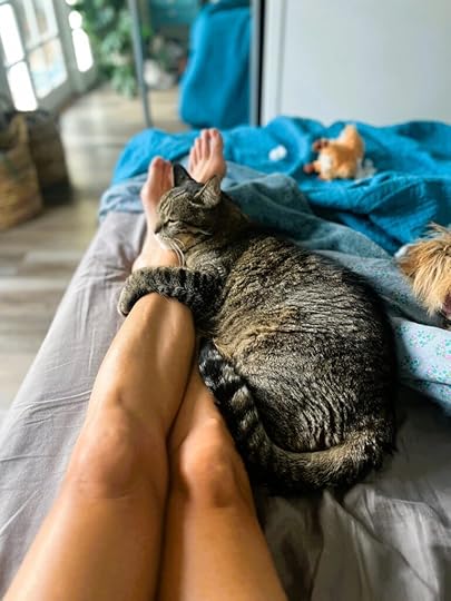 From top to bottom: My daughter and I attended an evening beach birthday last Friday and caught an amazing sunset; our driveway is a hotspot for political activism; the kitties continue to offer endless cuddles and entertainment.
