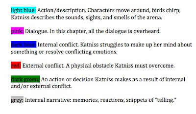 To shed light on this question, INTERN repaired to her secret basement Book Lab, where she soaked a randomly-selected chapter of The Hunger Games in a bath of chemicals designed to reveal the exact function of each sentence.