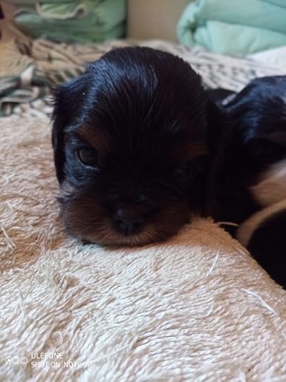 It’s not like the b/t boy is the cutest … although at the moment he’s my favorite … it’s just that I managed to get several quite good pictures of him this past weekend, so I thought I’d focus on him in one post. If I manage to get several good pictures of each puppy over the next week, that’d be nice, but (a) the camera in my new phone is inferior to the camera in my old phone; and (b) puppies are wiggly little monsters and produce a whole lot of blurry pictures for every good one.