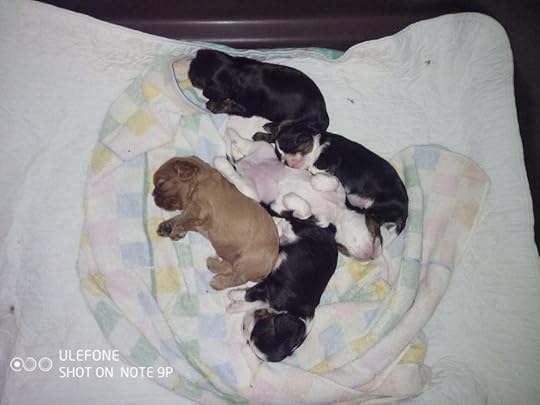 Meanwhile! They are all actually developing really fast. All but the ruby girl wobbled up to their feet around two weeks — very early for Cavalier puppies. She is up now too, she is just really fat and it slowed her down. They are all showing a little bit of play behavior now, mouthing each other and my finger with their tiny toothless mouths. They stay awake for a full minute or so after nursing, playing a little and wobbling around, and then collapse and sleep till time to nurse. Impossible to see anything about their individual personalities yet, but you sure see species-specific play behavior. They grab each other’s ears and do that sideways jerk that will someday kill a rabbit if they catch one.