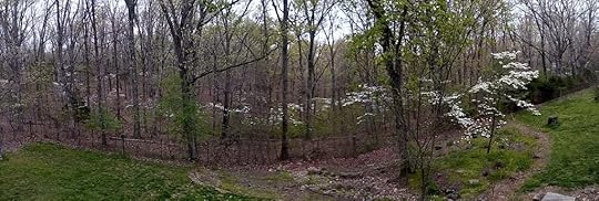 I just realized I happened to be experimenting with the panorama function on my new phone’s camera at the right time to be able to post these contrasting pictures. You can actually still make out the nearest flowering dogwood, barely, even in the photo with the snow.