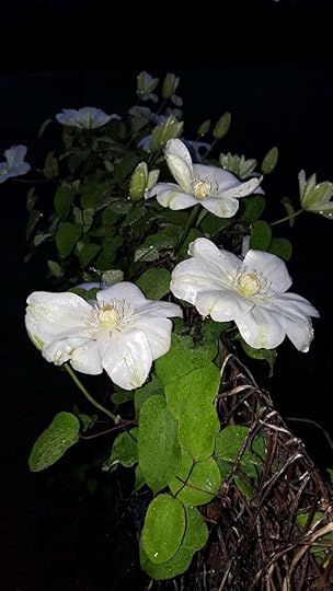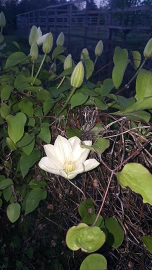 Each of these pictures was taken at dawn. The first was taken a couple days ago, the other yesterday morning. These are some kind of clematis; I don’t remember the variety.