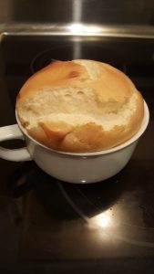 This was not a complete success. I mean, the dessert – redefined here as a breakfast item – was very good and I will no doubt make it again, probably tomorrow. But it was neither as white and innocent looking as I might have liked, nor can I quite see how to get the filling to “explode” out of the dish when a spoon is poked into it. In this case, the filling was certainly completely passive and non-explosive.