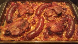 The skin on top of the chicken thighs crisped up beautifully. (Of course the skin on the bottoms of the thighs did not, but if you have a lot of dogs hanging around hoping for a share, that problem takes care of itself.) The sausages also crisped up, and the beans held their shape but were wonderfully soft and creamy, and basically the whole thing was *really good.* This is definitely a dish you could make for a special occasion. If you do try it, I hope you enjoy it as much as my family did.