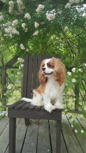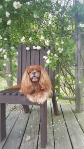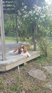 Sorry, no pictures of Pippa! Now that she is deaf, it is practically impossible to get her to look in a particular direction or stop panting. I got some wonderful pictures of her with a different rose on this same gazebo when she was much younger. That was ‘Renee,’ a beautiful pink climber, but unfortunately that one was not immune to rose rosette.