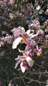 Fifth to bloom: The star magnolia, M. stellata. Mine, a variety called ‘Waterlily’ is very slow-growing and may never get taller than me at this rate. It’s a good choice if you don’t have much space, but I have seen some individual star magnolias that eventually got fairly sizable. The flowers are not fragrant.