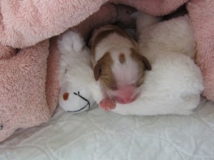 Although Kenya’s puppies were all still alive as of last Friday, all but one were dead as of the c-section this morning. This puppy is a girl, 8.3 oz — which is a good size — beautifully marked except for a very definite smudge on her face. The smudge is not a total killer in the show ring, but it is definitely not desirable.