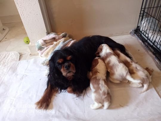 Then I do stuff with the puppies. I carry the big two puppies outside, deposit them in the semi-puppy-secure spot under the deck, go in to clean up the puppy room — not much cleanup, yay, they are trying hard to be housetrained, pretty impressive at six weeks of age. Then I put softened kibble down for Leda’s puppies and transfer them from the playpen to the puppy room, where they can have so much more space and learn to move away from the den to do their business. Then I bring the big puppies in and put softened kibble down for them, which the blenheim puppy is MORE THAN HAPPY TO EAT. I watch for a minute and then hand-feed the tricolor puppy some of the soft kibble. Then I take them out again. Then I bring them in again. Then I feed the adult dogs, including Elli, who is staying with me again for a month. Then I take the two big puppies out AGAIN and then let them loose to run around in the living room, making a firm mental note to look down before I take a step.
