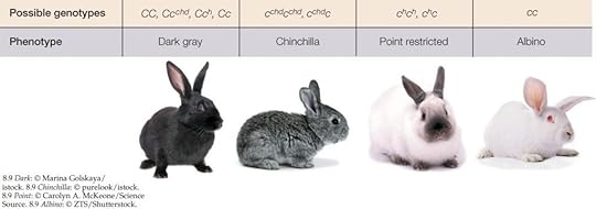 7) In rabbits, one gene with four alleles controls a set of colors, as shown below. Dominance is complete in order from left to right.