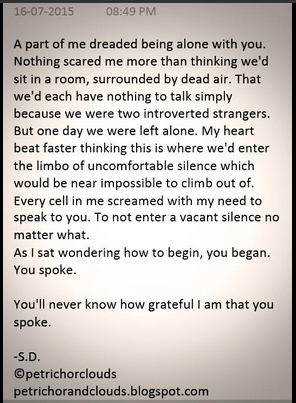 And then another question surfaced – what was she going to tell her boss about skipping work today? At that instant she knew, she was going to say yes to being “his guide for the day” Copyright Petrichor and Clouds 2015 at petrichorandclouds.blogspot.com