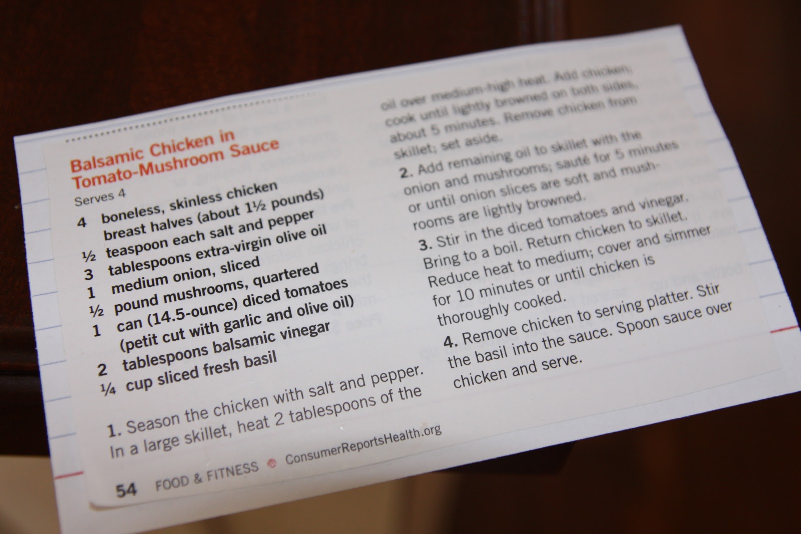 First, I make a list of what I am going to make that week, and then if they are recipe cards from magazines or printed from the internet, I make a little index card. The front has a picture of the recipe on it and the back has all the directions. Want a picture? Good. Because I am about to go all Pioneer Woman on you.