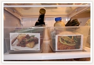 So, then I get all the ingredients (except for the dry stuff, which I set aside in the pantry together and pre-measure if it makes sense) and put them in a tub like this with the cute little picture on the front. I can fit four across the fridge shelf. I even chop stuff beforehand if it makes sense to do it.