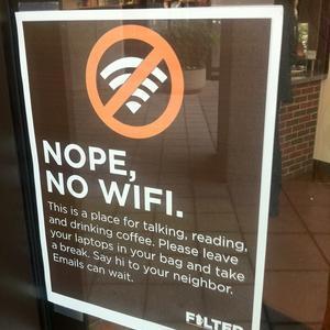 على باب أحد أحدث مقاهي العاصمة الأمريكية تقابلك لوحة عليها إشارة ممنوع فوق العلامة التي تشير لتوفر خدمة شبكة الاتصال اللاسلكية (Wi-Fi)، وقد كُتب تحتها: