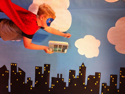 To add to the fun, our library made this awesome photo background (complete with cape and mask) for our photographing pleasure.