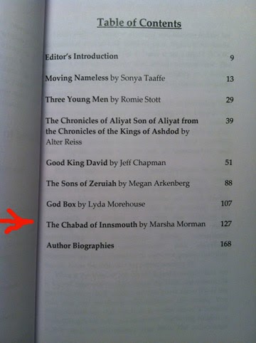 It's a short story (about 13,000 words if I remember correctly) concerning a rabbi who runs into ancient creatures who secretly rule an evil town in Massachusetts. It's heavily based on H.P. Lovecraft's Shadow over Innsmouth, which is one of my favorite Lovecraft stories. Since it had a Jewish spin, it qualified for the anthology.