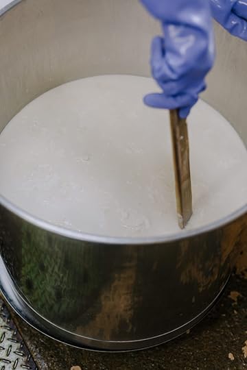 When the soy milk is the right temperature, add the nigari and slowly, briefly stir through the nigari. Cover and let the soy milk sit for 3-5 minutes, then slowly stir with a spatula to the bottom of the pan. You should see the curds, or oboro now, be careful not to break them up. Cover and let sit a further 3-5 minutes.