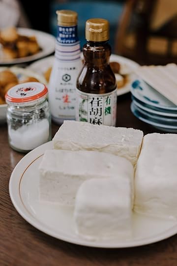 Fresh tofu like this needs only a few toppings — my favourites are a bit of grated ginger, some finely sliced green onion (or myoga or shiso if you can get these!), katsuobushi flakes, toasted sesame seeds or some finely sliced cucumber, and finally a splash of soy sauce over it all.
