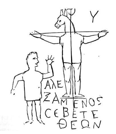 The Alexamenos graffito from roughly 200ad. One of the earliest surviving depictions of Jesus is a bit of graffiti scratched on a wall in Rome! The Greek inscription reads, “Alexamenos worships his God,” and is likely meant to both make fun of Jesus, and to make fun of people who were crucified. The donkey head is part of the reviling, and reveals what the Romans thought of crucifixion.