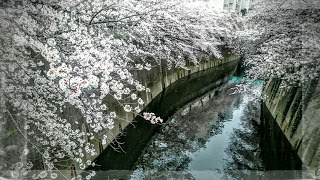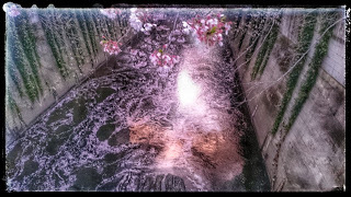 More photos of Sakura along Kanda River in the Nishwaseda section of Tokyo, under a cloudy sky, just a day or two from full blossom.