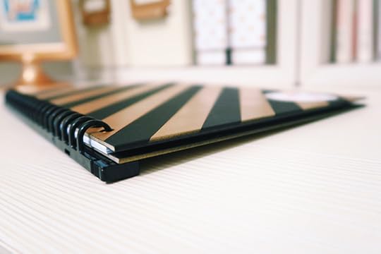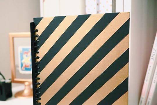 使用格子活頁紙、現成厚紙板筆記本封面,再加上可拆式活頁本環圈,組裝起來有已經有雛形了,然後用紙膠帶遮蓋想要留下的黑色部分,使用金色噴漆,將筆記本噴成喜歡的條紋圖樣,非常簡單就大功告成啦!