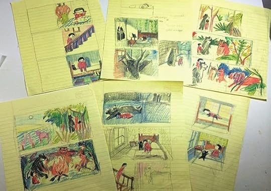 But I start to write anyway, this time I drew this little boxes and draw tiny pictures in them(They call this thumbnails). It helps me to see the whole story line. There's whole bunch of doodles following. Sometimes it works, and then it become a book. But lot of times, it goes into the drawer.