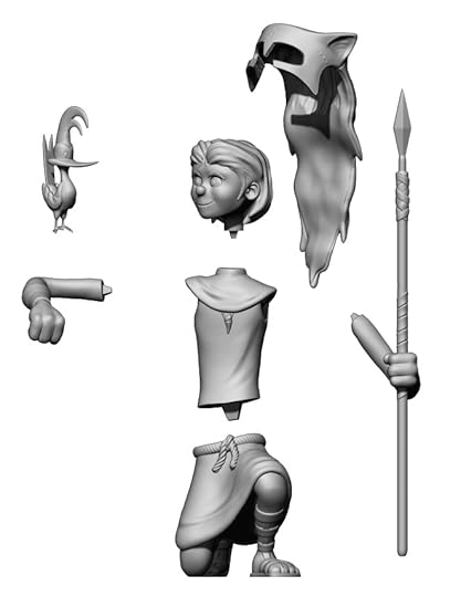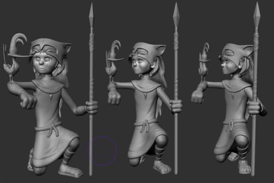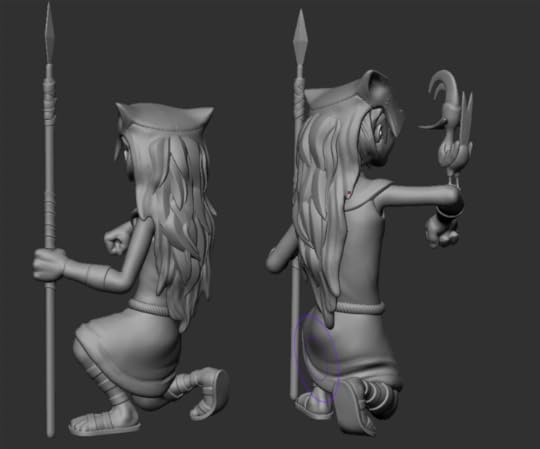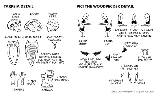 In the time since I did these 1st Edition sculpts, 3D printing has come a long way and I wanted to do another sculpt for the newest book using a 3D printer. First though, I had to find a sculptor who could bring Tarpeia to life and I was lucky to find digital sculptor Josh Hall. Once Josh and I synced up on what pose would be best for the sculpt and for printing I worked up a model sheet for Tarpeia and her pal, Pici the woodpecker.