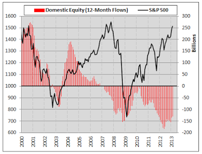 Take a look at the chart above. It shows the historical pattern of U.S. domestic equity fund flows paired with the S&P 500. While retail investors were seemingly caught off guard in the 2001 tech wreck, only to pull money from equity funds as the market fell to new lows, the stock market crash of 2008 paints a very different picture. While markets pushed ever higher throughout the fall of 2007, equities began to see negative fund flows as early as April, with money being pulled out of the market in increasing volume throughout the year, before the market began to topple in early 2008.