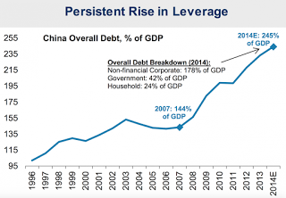 This has always been the rationale, hasn't it, or at least for the past ten years when debt in China, the US and around the world has exploded higher? The argument is supported by the primary metric for evaluating sovereign debt, the ratio of debt to GDP. China's total debt is currently 250% of GDP and, as shown from the chart to the rights, is expanding at an alarming rate.