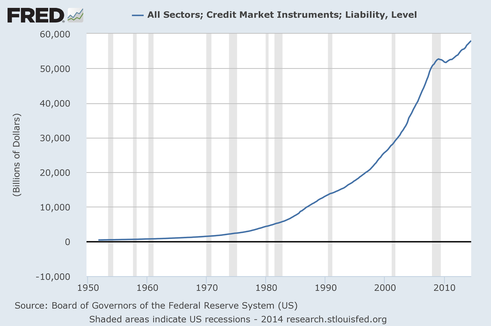 As can be seen from the graph below, debt levels are now once again at record levels, although today the debt is concentrated in the corporate and sovereign sectors, rather than the mortgage and financial sectors, as was the case leading up to the financial crisis. In fact, absolute debt levels in the US today are much higher than they were before the 2008 financial crisis.